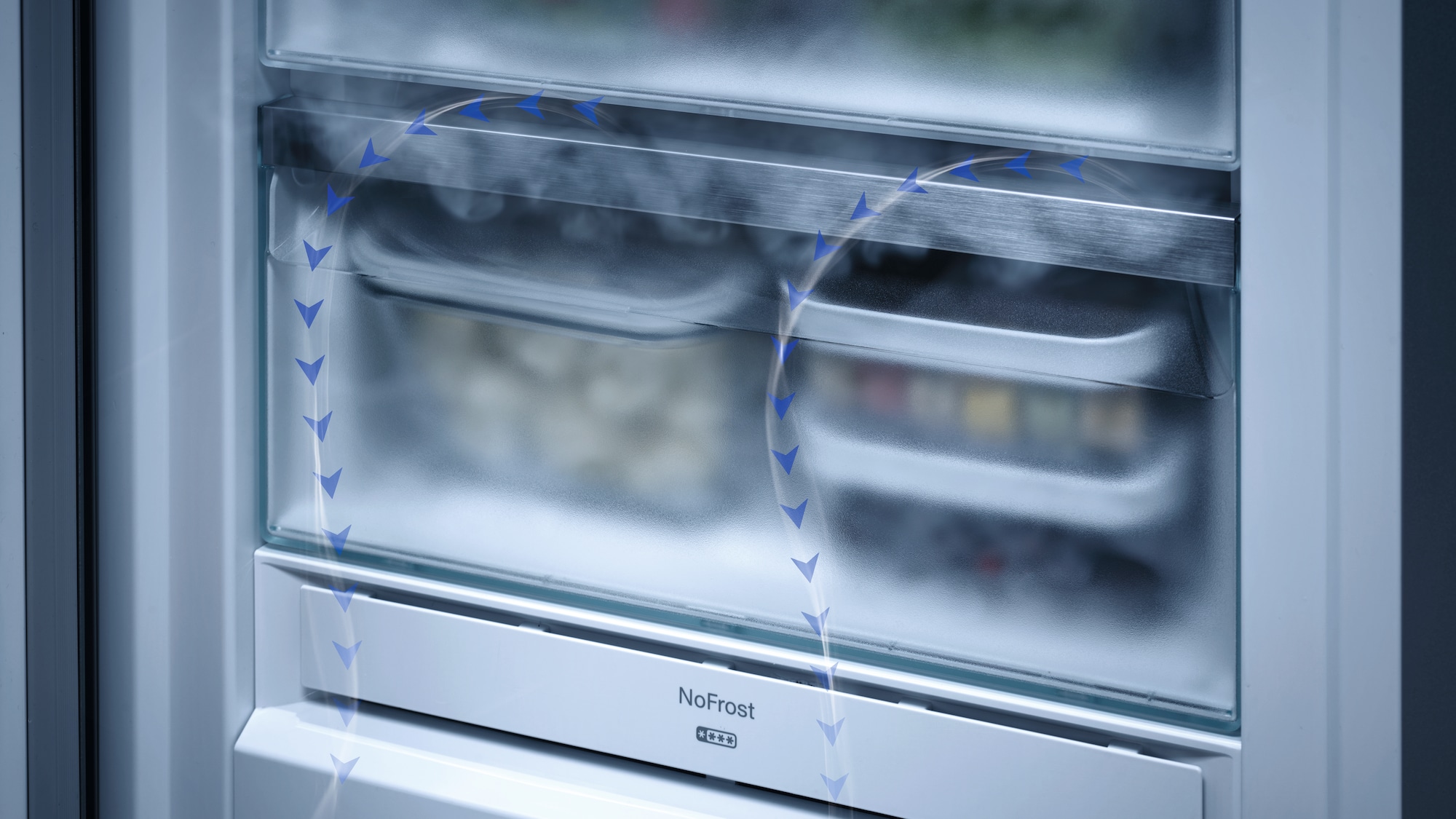 So systémom NoFrost nemusíte svoju mrazničku Miele už nikdy rozmrazovať. Pri cirkulačnom chladení sa studený, suchý vzduch distribuuje rovnomerne, aby sa vo vnútri nemohol tvoriť žiadny ľad. Vďaka tomu môžete bez problémov vytiahnuť zásuvky, na potravinách sa netvorí žiaden ľad a zachovajú sa optimálne podmienky skladovania.