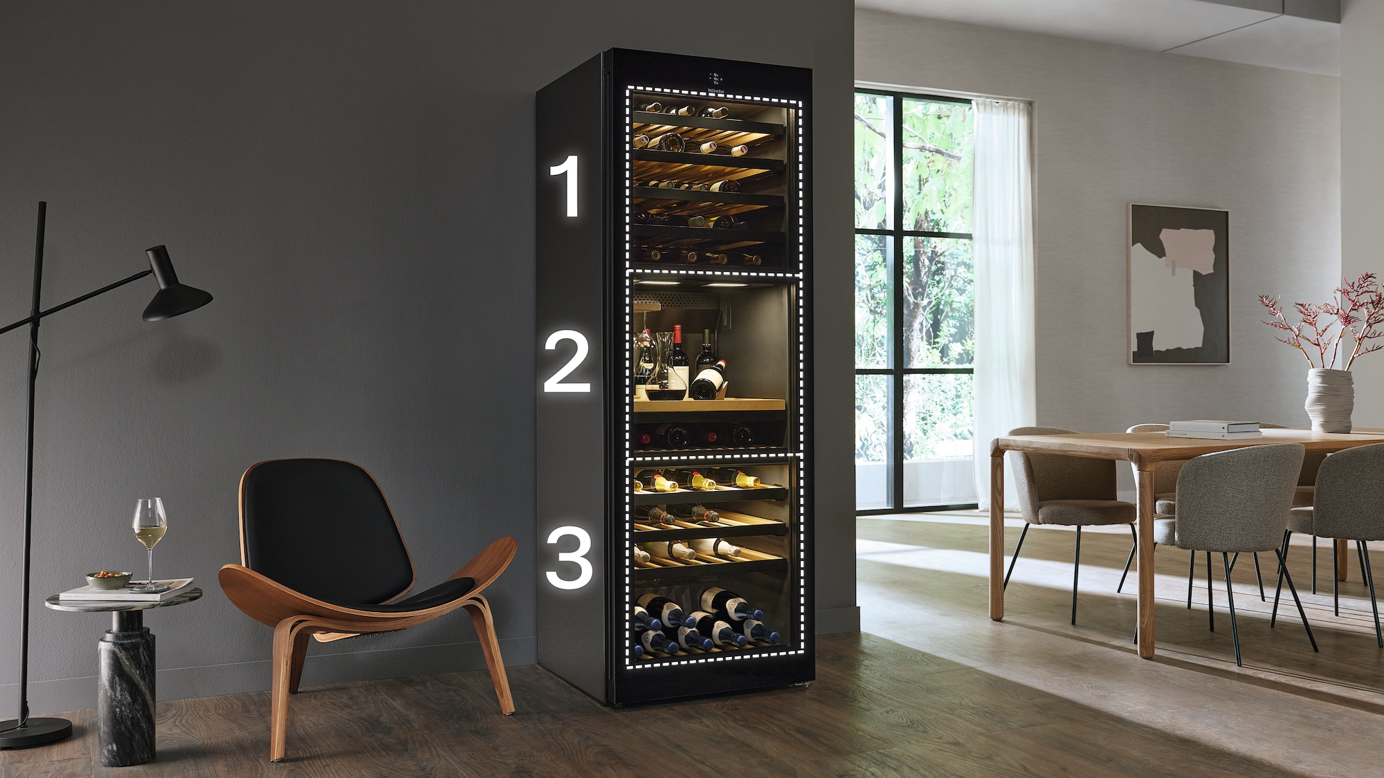 Vinotéky Miele majú až tri teplotné zóny, v ktorých môžete skladovať svoje obľúbené vína – či už ide o vynikajúce šampanské alebo plné Bordeaux. Každú zónu si môžete individuálne prispôsobiť tak, aby ste v nej mohli skladovať rôzne vína, od červených cez biele až po šumivé. Vďaka presnej regulácii teploty uskladníte každú fľašu pri dokonalej teplote na pitie.