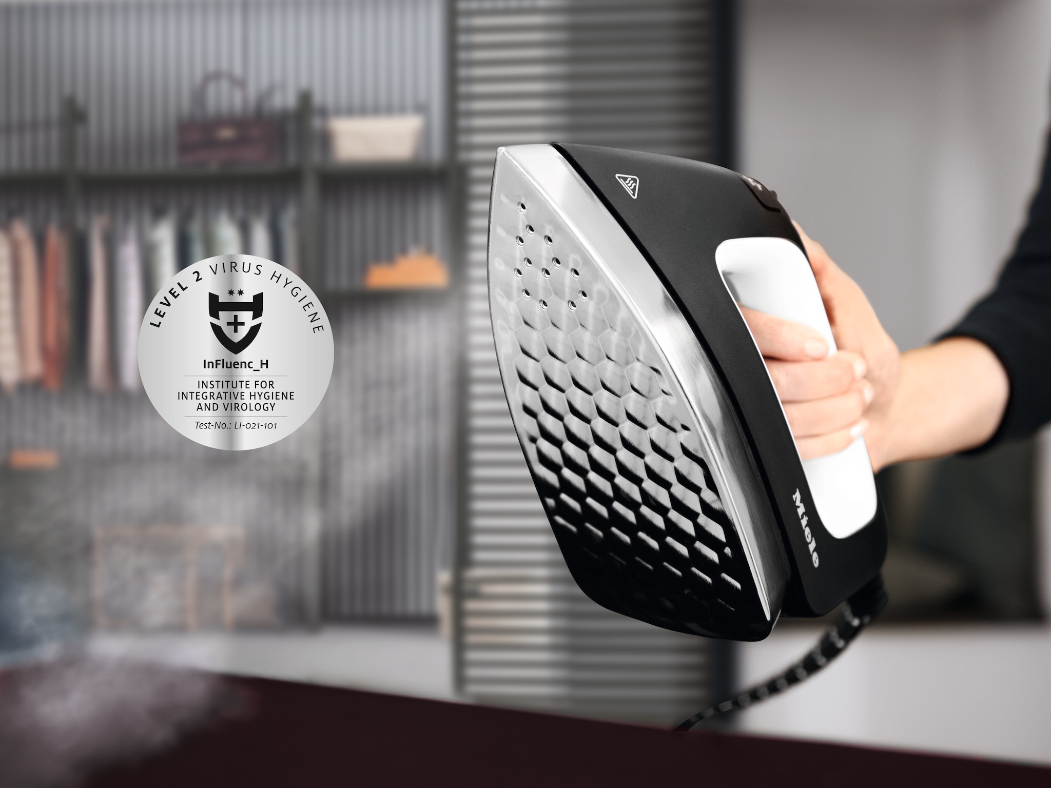 - 4.S výnimkou hepatitídy typu B pomocou žehličky (stupeň výkonu 3) pri jednovrstvových textíliách alebo naparovača – ak je pri danom modeli k dispozícii. Vedecky testované na nemeckej vysokej škole Albstadt-Sigmaringen a označené striebornou etiketou Inštitútu pre integratívnu hygienu a virológiu InFluenc_H. Popis metódy nájdete na: www.miele.com/fm-c
