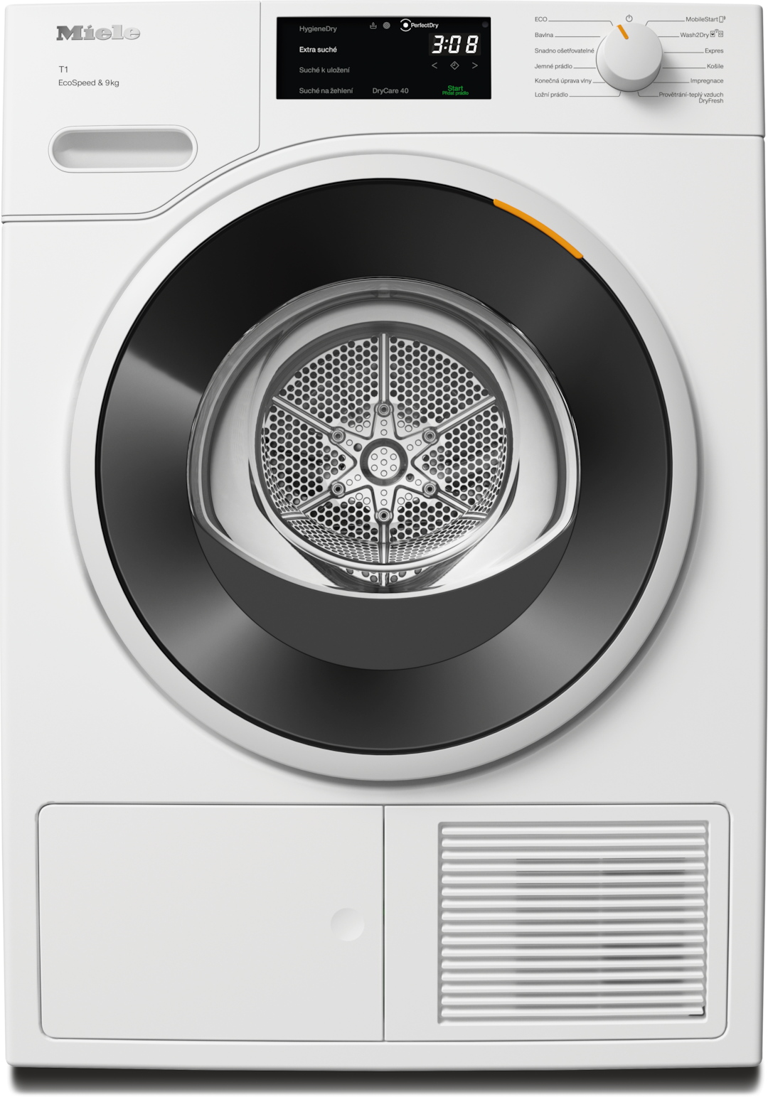 - 4.Úspora času vypočítaná v porovnaní so sušičkami Miele bez funkcie EcoSpeed s rovnakým množstvom naplnenia a podobnou energetickou účinnosťou. Testované v programe Bavlna pri plnej náplni.